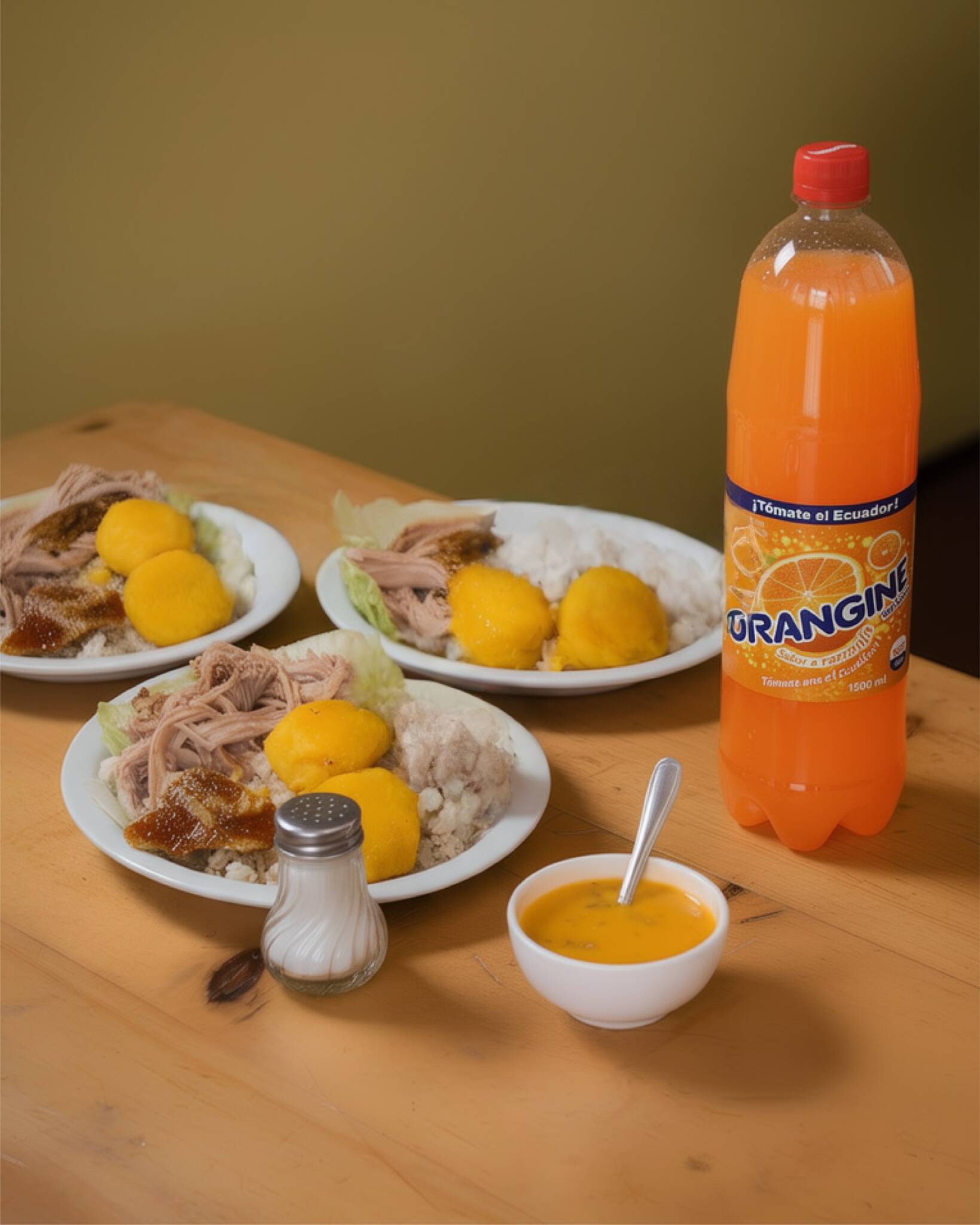 Majado servido con caldito, hornado, huevo y jugo natural
